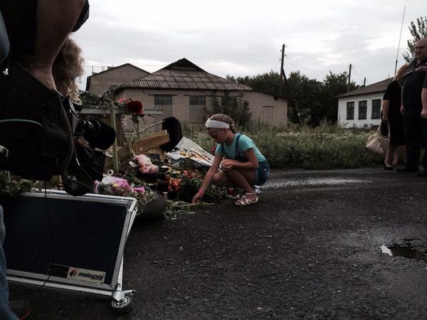 Photo of young girl in Ukrainian village creating memorial for #MH17 victims.