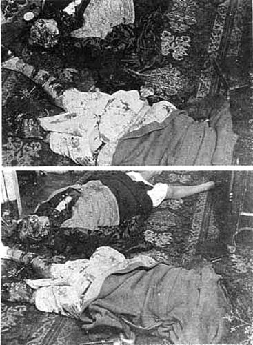 Sebaik saja memasuki rumah itu, polis menaiki tangga dan menemui dua mayat dlm keadaan yg mengerikan. Kebanyakan kecederaan tertumpu pd muka dan kepala mangsa. Walau bagaimanapun, kedua2 belah kaki dan punggung si anak mempunyai kelaran pisau yg dalam. Kedua2 wanita sukar dikenalpasti kerana wajah mereka telah hancur sama sekali. Beberapa batang gigi bertaburan di ruang itu, salah satu biji mata Geneviéve berada di anak tangga paling atas. Para penyiasat kemudiannya menemui satu lg biji mata gadis itu di bwh mayatnya. Tersembunyi di dlm lipatan skarf leher Pn Léonie Lancelin, adalah dua biji matanya sendiri. Mayatnya terlentang dgn kedua2 kakinya terbuka luas, memakai satu kasut saja. Geneviève pula ditemui tertiarap. Di sebelah mayatnya adalah sebilah pisau dapur. Kesemua kuku mereka telah dicabut. Tempat kejadian spt disimbah dgn darah, malah penyiasat mengesan percikan darah di dinding setinggi 2meter dari mayat2 itu.